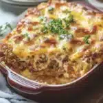 This casserole keeps the meatloaf flavors while using cheese and sauce to prevent dryness – the milk and eggs bind the beef and breadcrumbs, while the cheese melts into pockets keeping every bite moist. The tomato sauce on top caramelizes slightly, creating a sweet-savory glaze similar to a traditional meatloaf topping but easier to spread. Using a mix of cheddar and mozzarella gives sharp flavor and stretchy, melty texture. The layers let you serve neat squares that hold together, unlike crumbly meatloaf that can fall apart when sliced.